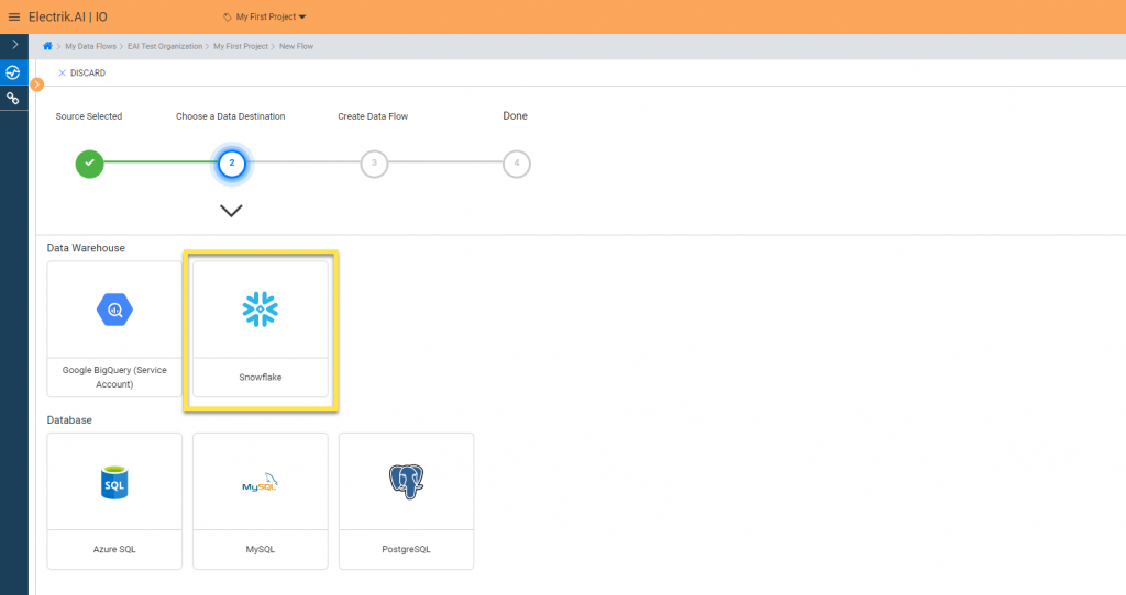Step 8: Select your existing Snowflake connection in Electrik.AI.